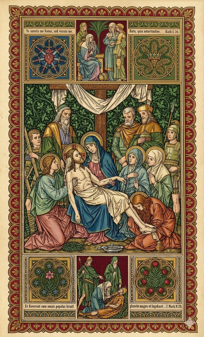 Background: The vine motif continues from the crucifixion image, symbolizing the “True Vine,” but here the atmosphere is one of stillness and grief rather than active sacrifice.